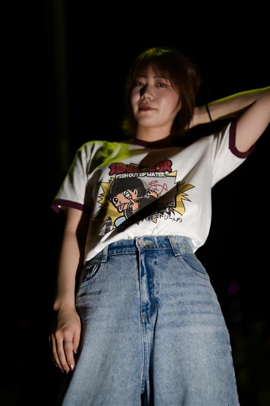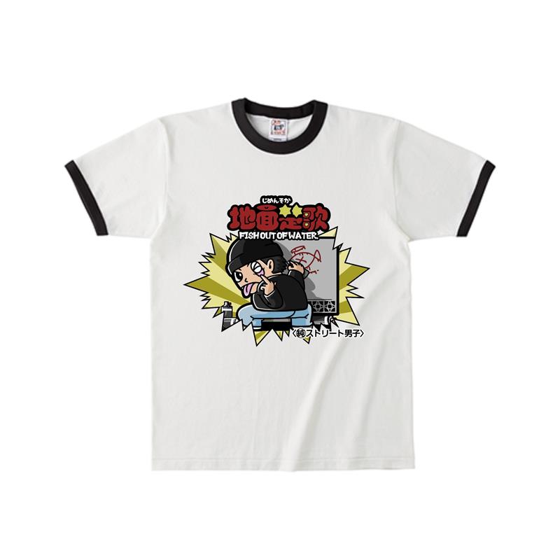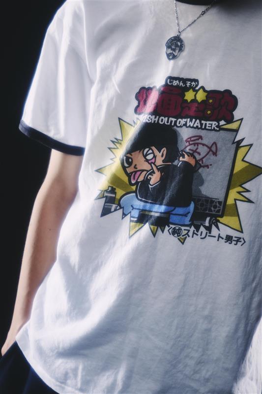 ビックリマンなテイストで描かれたリンガーTシャツ。準チョコレート菓子ならぬ、”純ストリート男子”がイリーガルにボミングする様子を落とし込んだ。ボディはCross stitch オープンエンドマックスウェイトリンガーTシャツ。