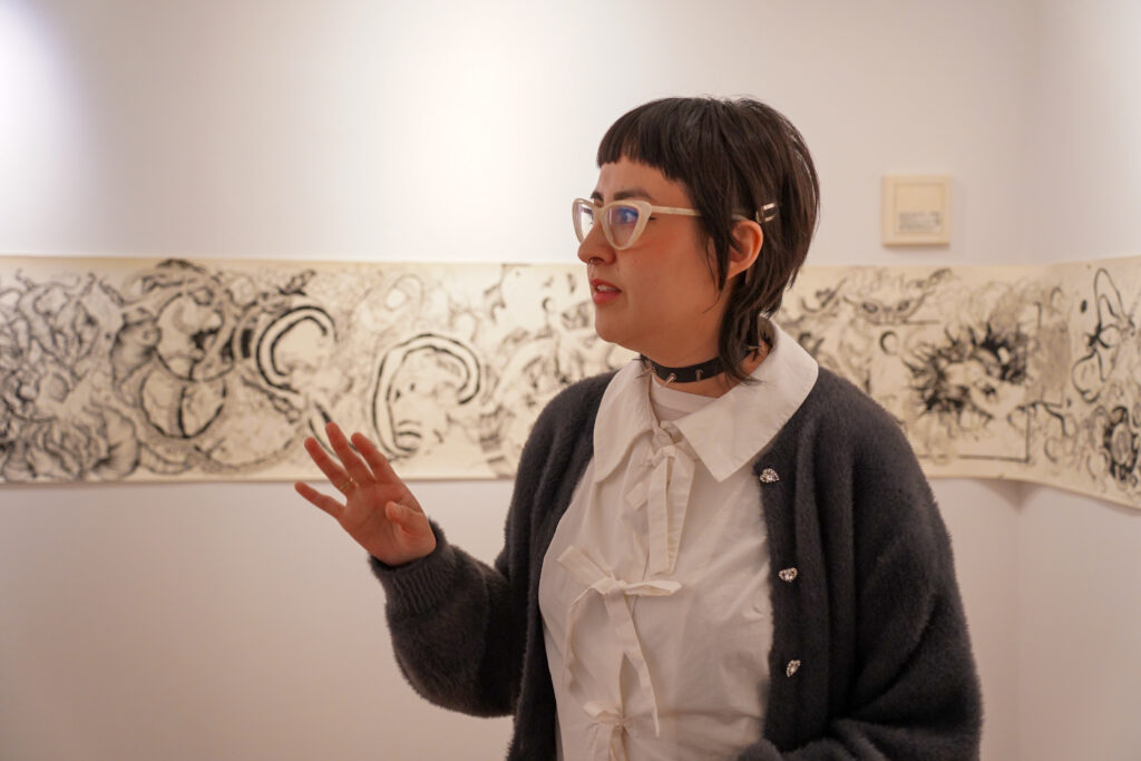 Q:ありがとうございます。Pamelaさんの作品は、特に大きなドローイングが印象的ですが、テーマは何でしょうか?