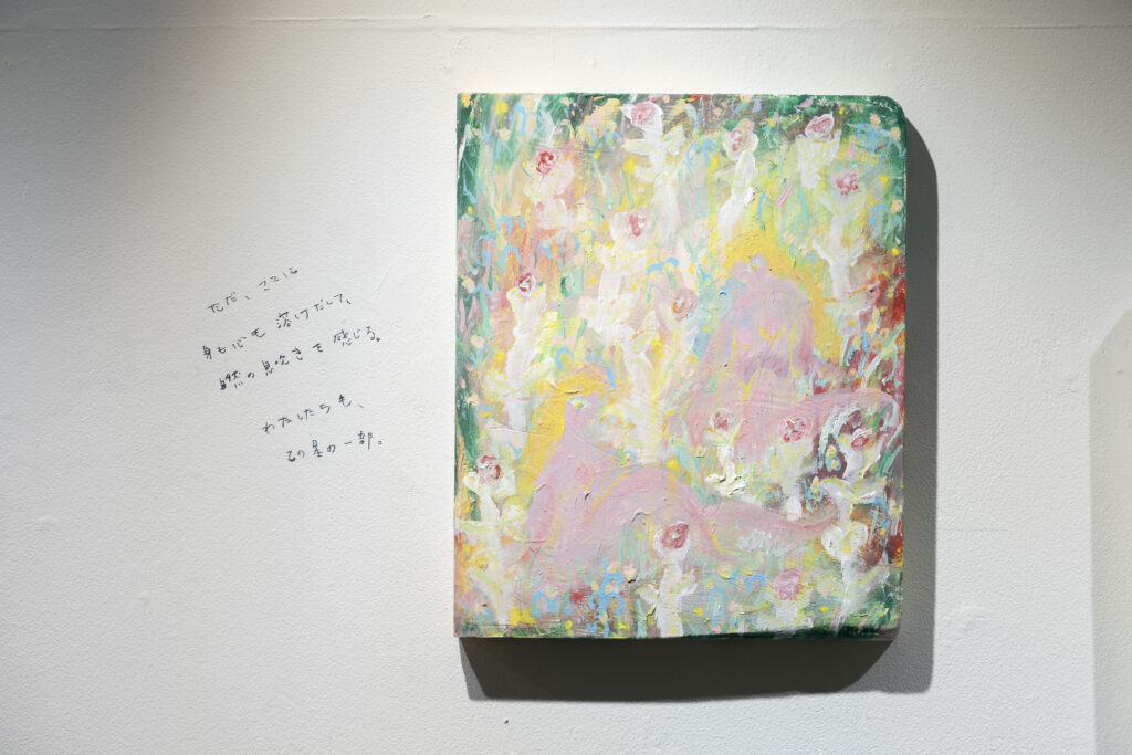 Overall, I want to express a positive mindset. However, instead of ignoring negative emotions like sorrow and anger, I embed the message that you shouldn’t forget a small, internal positive feeling, like saying “it’s okay,” or the feeling that “you are not alone”. It’s not necessary to be cheerful all the time; the sudden “moment of realization” is what’s important. I hope the works can be like an amulet for that. I also convey the importance of “acting for oneself”—like making “one’s own living cells happy”.
